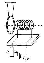Задание 27. Многовитковая катушка медного провода подключена к источнику тока через реостат. Вблизи торца катушки на шёлковых нитях подвешено замкнутое медное кольцо с малым сопротивлением. Ось кольца совпадает с осью катушки (см. рисунок). Опишите, как начнёт двигаться кольцо (притянется, оттолкнётся или останется неподвижным относительно катушки), если движок реостата резко сдвинуть вниз в крайнее положение. Ответ поясните, указав, какие физические явления и закономерности Вы использовали для объяснения.
