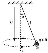 Задание 31. В однородном магнитном поле с индукцией В, направленной вертикально вниз, равномерно вращается по окружности в горизонтальной плоскости против часовой стрелки положительно заряженный шарик, подвешенный на нити длиной l (конический маятник) (см. рисунок). Угол отклонения нити от вертикали равен α, скорость вращения шарика равна v. Найдите отношение заряда шарика к его массе q/m (удельный заряд). Сделайте рисунок с указанием сил, действующих на шарик.