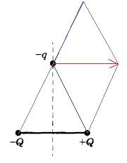 Учитывая, что однополюсные заряды отталкиваются, а разнополюсные – притягиваются, нарисуем силы, действующие на заряд –q (синие линии на рисунке ниже).