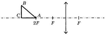 Задание 32. Равнобедренный прямоугольный треугольник ABC расположен перед тонкой собирающей линзой оптической силой 2,5 дптр так, что его катет АС лежит на главной оптической оси линзы (см. рисунок). Вершина прямого угла С лежит дальше от центра линзы, чем вершина острого угла А, расстояние от центра линзы до точки А равно удвоенному фокусному расстоянию линзы, АС = 4 см. Постройте изображение треугольника и найдите площадь получившейся фигуры.