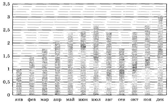 Задание 2. На диаграмме показан уровень инфляции в России в 2019 году на конец каждого месяца. По горизонтали указаны месяцы, по вертикали — уровень инфляции (в процентах) с начала года на конец указанного месяца. Сколько месяцев в 2019 году инфляция в России была отрицательной?