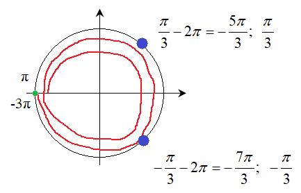 б) С помощью единичной окружности найдем корни уравнения, принадлежащие отрезку [-3π; π]: