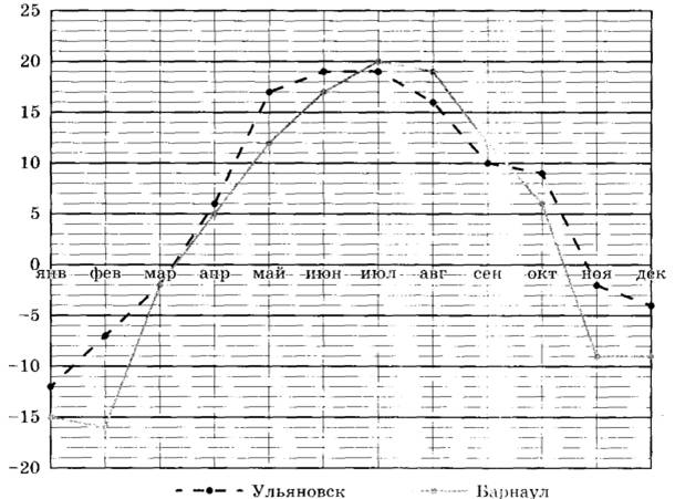 2 | На рисунке показано изменение средней температуры за каждый месяц 2019 года в Ульяновске и Барнауле. По горизонтали указаны месяцы, по вертикали — значение температуры в градусах Цельсия. Определите по рисунку, на сколько градусов средняя температура февраля в Ульяновске была выше соответствующей температуры в Барнауле. Ответ дайте в градусах Цельсия.