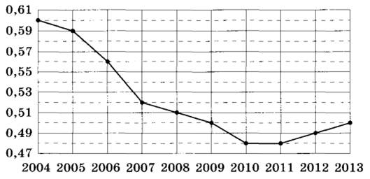 Задание 14. На рисунке точками показан прирост населения Китая в период с 2004 по 2013 год. По горизонтали указывается год, по вертикали — прирост населения в процентах (увеличение численности населения относительно прошлого года). Для наглядности точки соединены линией.
