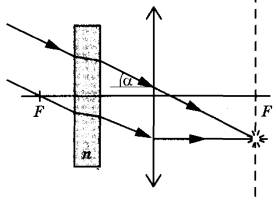 Задание 27. На тонкую собирающую линзу от удалённого источника падает пучок параллельных лучей (см. рисунок). Как изменится положение изображения источника, создаваемого линзой, если между линзой и её фокусом поставить плоскопараллельную стеклянную пластинку с показателем преломления n (на рисунке положение пластинки отмечено пунктиром)? Ответ поясните, указав, какие физические закономерности Вы использовали. Сделайте рисунок, поясняющий ход лучей до и после установки плоскопараллельной стеклянной пластинки.