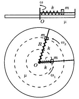 Задание 7. Маленькая шайба массы m, способная перемещаться вдоль гладкого стержня, находится на поверхности горизонтального диска, равномерно вращающегося с угловой скоростью ω1, на расстоянии r от оси O, с которой шайба соединена лёгкой недеформированной пружинкой жёсткости k (см. рисунок). Коэффициент трения между шайбой и диском μ. Как только угловая скорость начинает медленно и плавно возрастать, шайба начинает смещаться. При угловой скорости ω2 расстояние до оси стало R, при этом диск стал вновь вращаться равномерно.
