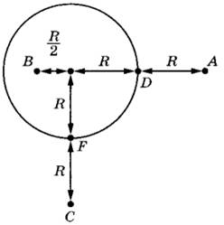 Задание 16. На уединённой неподвижной проводящей сфере радиусом R находится положительный заряд Q. Сфера находится в вакууме. Напряжённость электростатического поля сферы в точке А равна 36 В/м. Все расстояния указаны на рисунке. Выберите два верных утверждения, описывающих данную ситуацию.