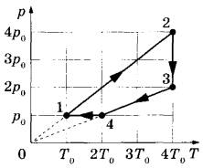 В процессе 3-4 газ изохорно уменьшил свою абсолютную температуру и давление в 2 раза, а в процессе 4-1 изобарно вернулся в исходное состояние, согласно закону Гей-Люссака V/T = const уменьшив абсолютную температуру и свой объём в 2 раза (см. рисунок).