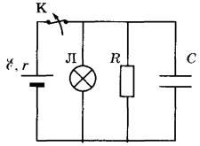 Задание 31. К аккумулятору с ЭДС E = 50 В и внутренним сопротивлением r = 4 Ом подключили лампу сопротивлением Rл = 10 Ом и резистор сопротивлением R = 15 Ом, а также конденсатор ёмкостью С = 100 мкФ (см. рисунок). Спустя длительный промежуток времени ключ К размыкают. Какое количество теплоты выделится после этого на резисторе?