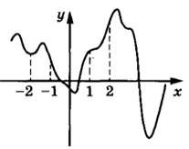 Задание 6. На рисунке изображён график y = f(x). На оси абсцисс отмечены точки -2, -1, 1, 2. В какой из этих точек значение производной наименьшее? В ответе укажите эту точку.