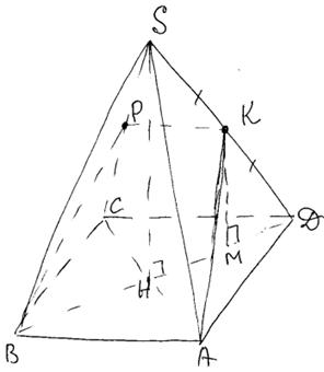 четырехугольная, следовательно, в ее основании лежит квадрат ABCD. Плоскость AKB (K – середина SD) пересекает