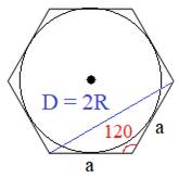 Найдем сторону этого шестиугольника из треугольника, у которого известен угол 120 градусов между сторонами и противолежащая сторона D = 2√3. По теореме косинусов можно записать: