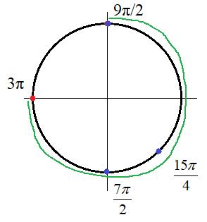 б) Используя единичную окружность, найдем корни этого уравнения, принадлежащие отрезку [3π; 9π/2]: