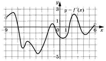 6 | На рисунке изображён график y = f’(x) — производной функции f(x), определённой на интервале (-9; 6). Найдите количество точек минимума функции f(x), принадлежащих отрезку [-8; 5].