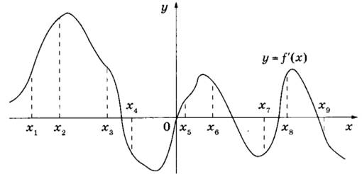 6 | На рисунке изображён график y = f’(x) — производной функции f(x). На оси абсцисс отмечено девять точек: x1, х2,…, х9. Найдите количество точек, лежащих на промежутках возрастания функции f(x).