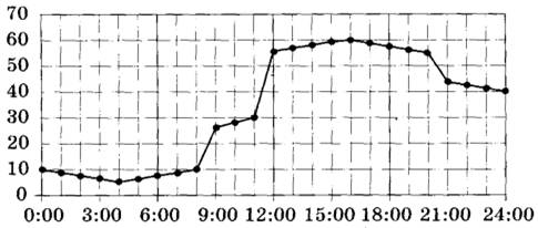 14 | На рисунке точками показано потребление воды городской ТЭЦ на протяжении суток. По горизонтали указывается время, по вертикали — объём воды в кубометрах в час. Для наглядности точки соединены линией.