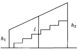 10 | Перила лестницы дачного дома для надёжности укреплены посередине вертикальным столбом. Найдите высоту l этого столба, если наименьшая высота h1 перил равна 1,9 м, а наибольшая высота h2 равна 2,9 м. Ответ дайте в метрах.