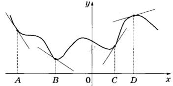 14 | На рисунке изображены график функции и касательные, проведённые к нему в точках с абсциссами А, В, С и D.