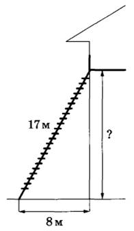 10 | Пожарную лестницу длиной 17 м приставили к окну дома. Нижний конец лестницы отстоит от стены на 8 м. На какой высоте находится верхний конец лестницы? Ответ дайте в метрах.