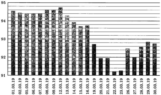 4 | На диаграмме показан курс киргизского сома, установленный Центробанком РФ, на все рабочие дни марта 2019 года. По горизонтали указаны числа месяца, по вертикали — цена 100 киргизских сомов в рублях.