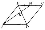 15 | В параллелограмме ABCD отмечена точка М — середина стороны ВС. Отрезки BD и AM пересекаются в точке K. Найдите длину отрезка BK, если BD = 15.