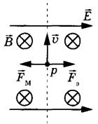 скорости которого перпендикулярен E и B, как показано