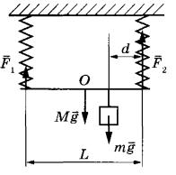 Задание 30. К двум вертикально расположенным пружинам одинаковой длины подвесили однородный стержень длиной L = 40 см. Если к этому стержню подвесить груз массой m = 3 кг на расстоянии d = 5 см от правой пружины, то стержень будет расположен горизонтально, а растяжения обеих пружин будут одинаковы (см. рисунок). Жёсткость левой пружины в 3 раза меньше, чем у правой. Чему равна масса М стержня? Сделайте рисунок с указанием сил, использованных в решении задачи.