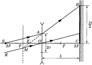2. Для получения светлого пятна на экране рассмотрим ход луча SA, который падает от источника, расположенного на двойном фокусном расстоянии от линзы, на край непрозрачной оправы. Чтобы построить преломлённый линзой луч, необходимо воспользоваться свойством тонкой рассеивающей линзы: продолжения всех параллельных лучей пересекаются в одной точке передней фокальной плоскости. Строим параллельный лучу SA луч KO, проходящий через оптический центр линзы О; находим его пересечение с фокальной плоскостью (точка М) и достраиваем преломлённый луч, который проходит через точки А и В. Полученный луч АВ позволяет определить на экране крайнюю точку В светлого пятна, радиус которого обозначен на рисунке как ВС. Точка Е является мнимым изображением источника S, так как в ней пересекаются луч SOC и продолжение луча SAB. Поэтому согласно формуле тонкой линзы