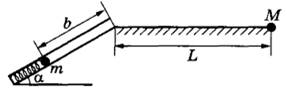 Задание 30. Пружинное ружьё наклонено под углом α = 30° к горизонту. Энергия сжатой пружины равна 0,41 Дж. При выстреле шарик массой m = 50 г проходит по стволу ружья расстояние b = 0,5 м, вылетает и падает на расстоянии L от дула ружья в точке М, находящейся на одной высоте с дулом (см. рисунок). Найдите расстояние L. Трением в стволе и сопротивлением воздуха пренебречь.