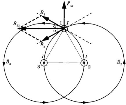 магнитных полей, созданных проводниками 2 и 3. Поскольку проводник 1 находится