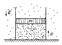 27 | В вертикальном цилиндрическом сосуде с гладкими стенками под подвижным поршнем площадью поперечного сечения 50 см2 находится разреженный газ (см. рисунок). При движении сосуда по вертикали с ускорением, направленных вверх и равным по модулю 2 м/с2, высота столба газа под поршнем постоянна и на 5 % меньше, чем в покоящемся сосуде. Считая температуру газа под поршнем неизменной, а наружное давление постоянным и равным 28 кПа, определите массу поршня. Масса газа под поршнем постоянна.