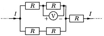 15 | Пять одинаковых резисторов с сопротивлением 15 Ом каждый соединены в электрическую цепь, через которую течёт ток I = 4 А (см. рисунок). Какое напряжение показывает идеальный вольтметр?