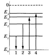 21 | На рисунке изображена упрощённая диаграмма нижних энергетических уровней атома. Нумерованными стрелками отмечены некоторые возможные переходы атома между этими уровнями. Какой из этих четырёх переходов связан с поглощением света наибольшей энергии, а какой — с излучением света с наименьшей длиной волны?