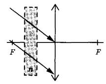 24 | На тонкую собирающую линзу от удалённого источника падает пучок параллельных лучей (см. рисунок). Как изменится положение изображения источника, создаваемого линзой, если между линзой и её фокусом поставить плоскопараллельную стеклянную пластинку с показателем преломления n (на рисунке положение пластинки отмечено пунктиром)? Ответ поясните, указав, какие физические закономерности Вы использовали. Сделайте рисунок, поясняющий ход лучей до и после установки плоскопараллельной стеклянной пластинки.
