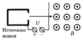 28 | Ион ускоряется в электрическом поле с разностью потенциалов U = 10 кВ и попадает в однородное магнитное поле перпендикулярно к вектору его индукции B (см. рисунок). Радиус траектории движения иона в магнитном поле R = 0,2 м, модуль индукции магнитного поля равен 0,5 Тл. Определите отношение массы иона к его электрическому заряду m/q. Кинетической энергией иона при его вылете из источника пренебрегите.