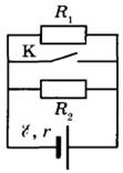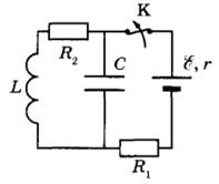 28 | На рисунке показана схема электрической цепи, состоящей из источника тока с ЭДС E = 12 В и внутренним сопротивлением r = 1 Ом, двух резисторов с сопротивлениями R1 = 8 Ом и R2 = 3 Ом, конденсатора электроёмкостью С = 4 мкФ и катушки с индуктивностью L = 24 мкГн. В начальном состоянии ключ К длительное время замкнут. Какое количество теплоты выделится на резисторе R2 после размыкания ключа К? Сопротивлением катушки пренебречь.