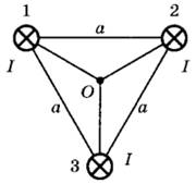 24 | Три параллельных длинных, прямых проводника 1, 2 и 3 перпендикулярны плоскости рисунка и пересекают её в вершинах равностороннего треугольника со стороной а. Токи в проводниках сонаправлены и равны I. Опираясь на законы электродинамики, определите направление вектора индукции результирующего магнитного поля в точке О — центре треугольника. Как изменится направление вектора индукции результирующего магнитного поля в точке О, если направление электрического тока в проводнике 3 изменить на противоположное?