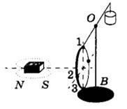 19 | Медное кольцо на горизонтальном коромысле поворачивается вокруг вертикальной оси ОВ под действием движущегося магнита (см. рисунок).