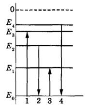 21 | На рисунке изображена упрощённая диаграмма нижних энергетических уровней атома. Нумерованными стрелками отмечены некоторые возможные переходы атома между этими уровнями. Какой из этих четырёх переходов связан с поглощением света наименьшей частоты, а какой — с излучением света наибольшей длины волны?