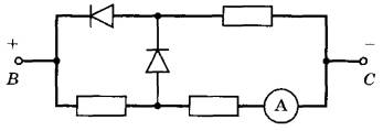 24 | Три одинаковых резистора и два одинаковых идеальных диода включены в электрическую цепь, показанную на рисунке, и подключены к аккумулятору в точках В и С. Показания амперметра равны 2 А. Определите силу тока через амперметр после смены полярности подключения аккумулятора. Нарисуйте эквивалентные электрические схемы для двух случаев подключения аккумулятора. Опираясь на законы электродинамики, поясните свой ответ. Сопротивлением амперметра и внутренним сопротивлением аккумулятора пренебречь.