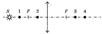 16 | Какая из точек 1-4 является изображением точки S (см. рисунок), создаваемым тонкой собирающей линзой с фокусным расстоянием F?