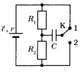 28 | В электрической цепи, показанной на рисунке, r = 1 Ом, R1 = 4 Ом, R2 = 7 Ом, C = 0,2 мкФ, ключ К длительное время находится в положении 1. За длительное время после перевода ключа К в положение 2 изменение заряда на правой обкладке конденсатора ∆q = -0,55 мкКл. Найдите ЭДС источника E.