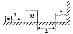 30 | Небольшой брусок массой m = 100 г, скользящий по гладкой горизонтальной поверхности, абсолютно неупруго сталкивается с неподвижным телом массой M = 2m. При дальнейшем поступательном движении тела налетают на недеформированную пружину, одним кондом прикреплённую к стене (см. рисунок). Через какое время t после абсолютно неупругого удара бруски вернутся в точку столкновения? Скорость движения бруска до столкновения v = 2 м/с, жёсткость пружииы k = 30 Н/м, а расстояние от точки столкновения до пружины L = 10 см.