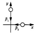4 | Два тела движутся по взаимно перпендикулярным пересекающимся прямым, как показано на рисунке. Модуль импульса первого тела p1 = 20 кг∙м/с, второго тела p2 = 15 кг∙м/с. Каков модуль импульса системы этих тел после их абсолютно неупругого удара?