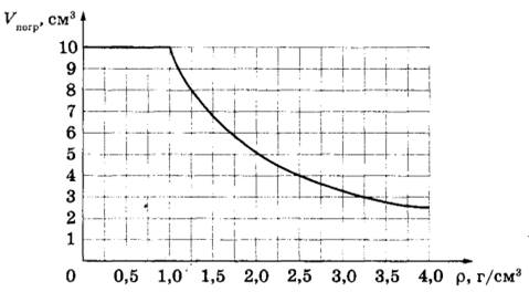 6 | Ученик помещал цилиндр объёмом V = 10 см3, не удерживая его, в различные жидкости, плотности которых представлены в таблице, и измерял объём погружённой в жидкость части цилиндра Vпогр. По результатам измерений была получена зависимость объёма погружённой части цилиндра Vпогр от плотности жидкости ρ (см. рисунок).