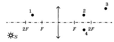 16 | Какая из точек 1-4 является изображением точки S (см. рисунок), создаваемым тонкой собирающей линзой с фокусным расстоянием F?