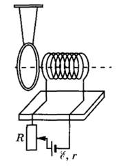 24 | Многовитковая катушка медного провода подключена к источнику тока через реостат. Вблизи торца катушки на шёлковых нитях подвешено замкнутое медное кольцо с малым сопротивлением. Ось кольца совпадает с осью катушки (см. рисунок). Опишите, как начнёт двигаться кольцо (притянется, оттолкнётся или останется неподвижным относительно катушки), если движок реостата резко сдвинуть вниз в крайнее положение. Ответ поясните, указав, какие физические явления и закономерности Вы использовали для объяснения.
