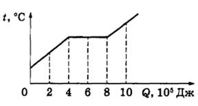 11 | На рисунке показан график изменения температуры вещества t по мере поглощения им количества теплоты Q. Масса вещества равна 0,2 кг. Первоначально вещество было в жидком состоянии. Какова удельная теплота парообразования вещества?
