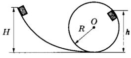 30 | Небольшой кубик массой m = 1,5 кг начинает скользить с нулевой начальной скоростью по гладкой горке, переходящей в «мёртвую петлю» радиусом R = 1,5м (см. рисунок). С какой высоты Н был отпущен кубик, если на высоте h = 2 м от нижней точки петли сила давления кубика на стенку петли F = 4 Н? Сделайте рисунок с указанием сил, поясняющий решение. Обоснуйте применимость используемых законов к решению задачи.