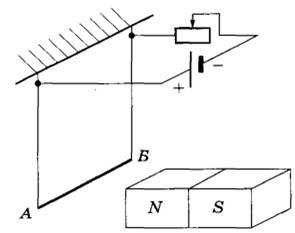 17 | Алюминиевый проводник АБ подвешен на тонких медных проволочках и подключён к источнику постоянного напряжения так, как показано на рисунке. Справа от проводника находится северный полюс постоянного магнита. Ползунок реостата плавно перемещают вправо.